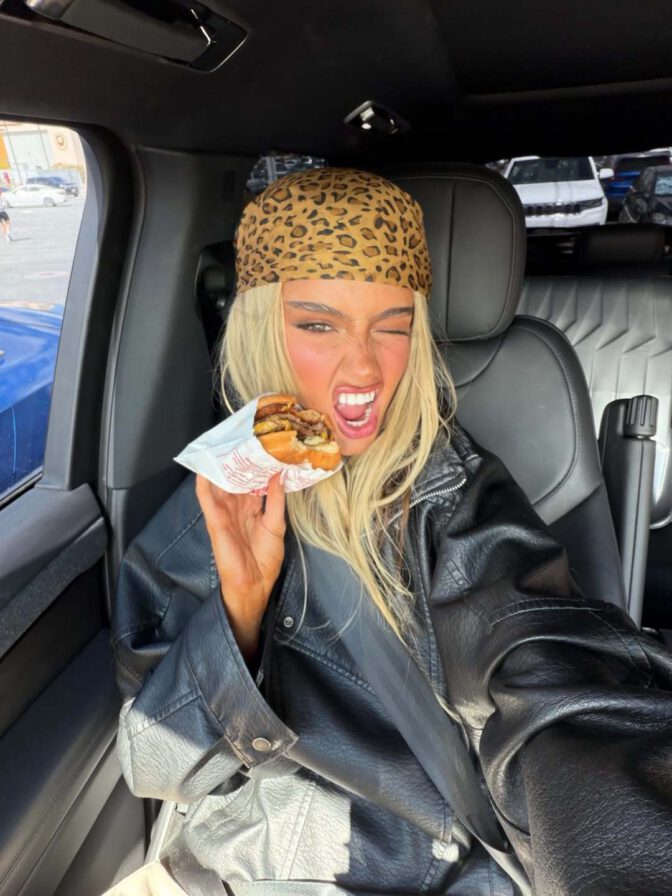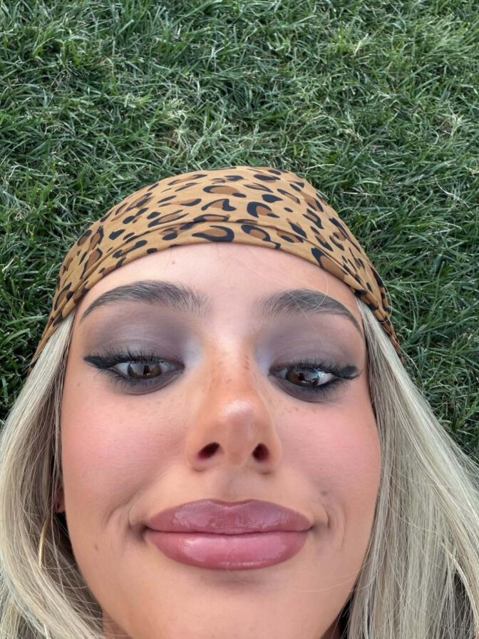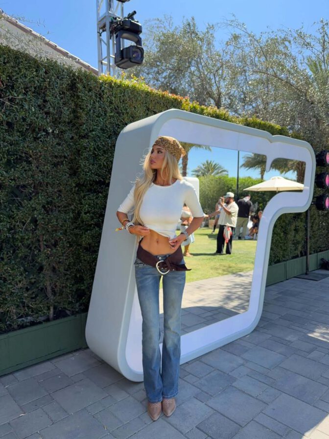 With her blonde locks flowing in the desert breeze, a leopard print bandana adorning her head, and sultry smoky eye makeup paired with luscious lips, Ella struck every seductive pose imaginable. Whether facing forward or turning around to flaunt her curves, she embodied a vivid daydream amidst the Coachella dust.