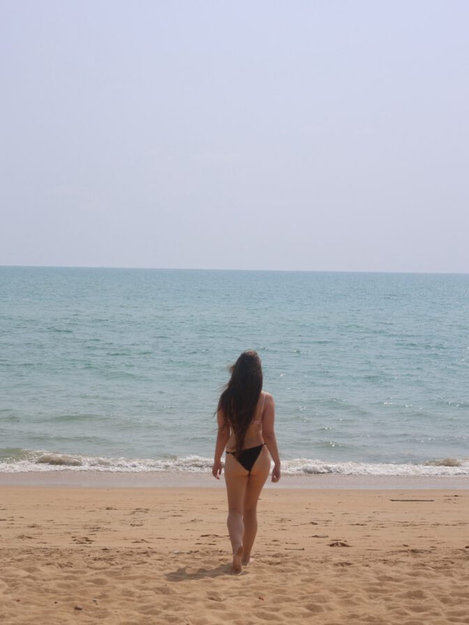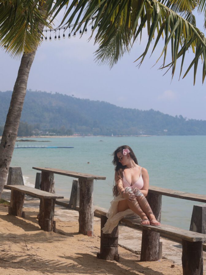 In one captivating image, she’s wading in the shallow surf, showcasing her black thong bottom and enticing backside as the water gently laps at her thighs. Other shots capture her lounging on wooden benches or leaning against palm trees, one hand playfully tousling her hair, sunglasses perched on her nose, lips slightly parted in an alluring manner.