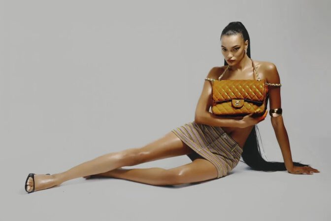 The stunning British model shines in the studio, her skin shimmering under bright lights. In various shots, her voluptuous breasts are on full display, while others feature intricate white silver body paint artfully draped across her chest, or a strategically placed vibrant yellow quilted bag. Her slender waist contrasts beautifully with a shiny red satin mini skirt that hugs her curves flawlessly, as well as a playful patterned skirt with daring cut-outs that reveal her backside.