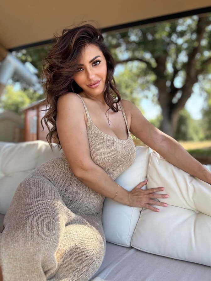 Hey everyone! The gorgeous Maddalena Cabizzosu, hailing from Sardinia and Italy, has just turned up the heat once again on Instagram, and we’re absolutely loving it. This dazzling 33-year-old model and dancer from Tuscany is seen relaxing on a plush white outdoor sofa, surrounded by lush greenery, while donning a radiant gold knitted dress that clings impeccably to her stunning silhouette.