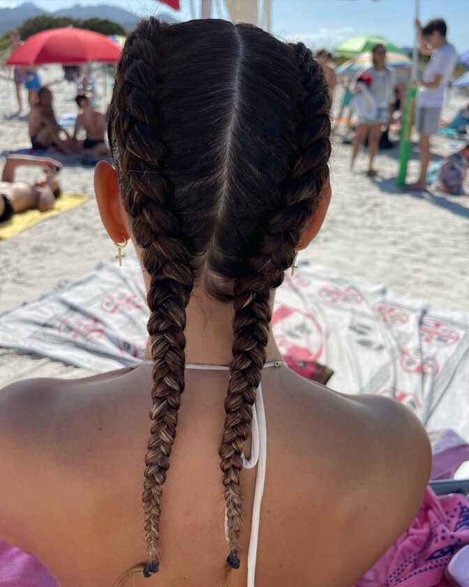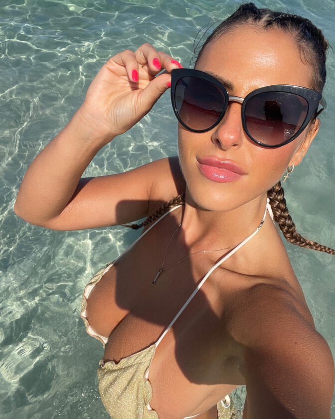 With a confident gaze, she lifts her black cat-eye sunglasses to reveal her luscious pink lips and perfectly shaped eyebrows. Her damp, dark hair cascades in seductive braids or soft waves over her shoulders, while her pink nails sparkle as she playfully shields her eyes or flirts with the camera. The delicate white strings of her bikini cut into her sun-kissed skin, accentuating her slim waist and those jaw-dropping curves that scream summer getaway.