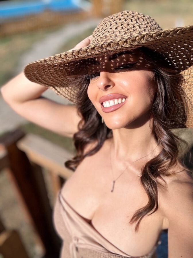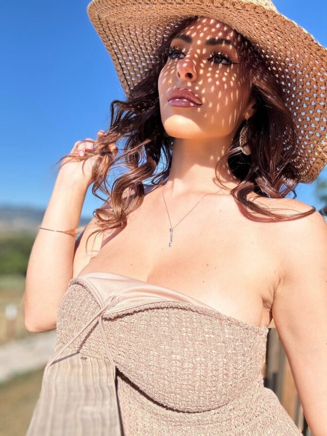 Her striking cleavage spills from the daring satin bandeau top, creating a captivating display that sparkles in the sunshine, enhanced by playful dotted reflections. An oversized woven straw hat casts charming shadows across her radiant face and décolletage as she grins with her luscious pink lips.