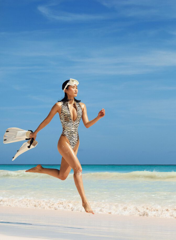 Whether she’s dashing along the beach with flippers in hand or wading through the waves with a coconut in tow, Miki’s slender waist, flat abs, and long legs create an unforgettable silhouette. The way the fabric molds to her body sparks intrigue, making it hard to look away.