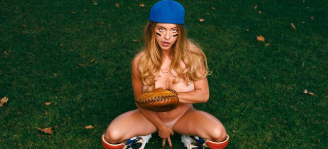 Next, we see her completely nude, squatting on the grass with a backward cap perched on her head. Her thighs are spread, and the barely-there glove offers minimal coverage over her trimmed area, while she playfully squeezes her glistening breasts together. On a vibrant yellow couch, she kicks her bare feet high, her sheer pink babydoll riding up as she flashes a cheeky pout with a pacifier resting between her lips.